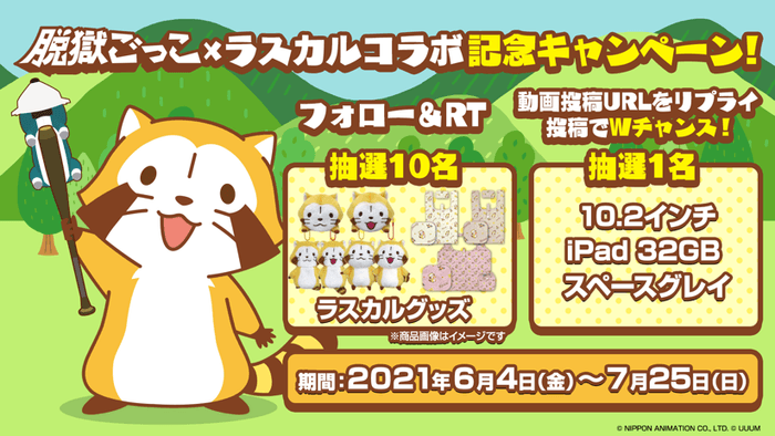 日本アニメーション株式会社(本社:東京都中央区、代表取締役社長:石川和子)がアニメーション制作・ライセンス管理を行う『あらいぐまラスカル』のキャラクター「ラスカル」とUUUM株式会社が運営する非対称型オンラインマルチ対戦ゲーム『脱獄ごっこ』との2度目となるコラボレーションの実施を決定いたしました。