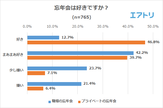 職場の忘年会とプライベートの忘年会について好きかどうか聞いたところ、どちらも過半数が「好き(職場:12.7%、プライベート:46.8%)」もしくは「まあまあ好き(職場:42.2%、プライベート:39.7%)」と回答しました。
