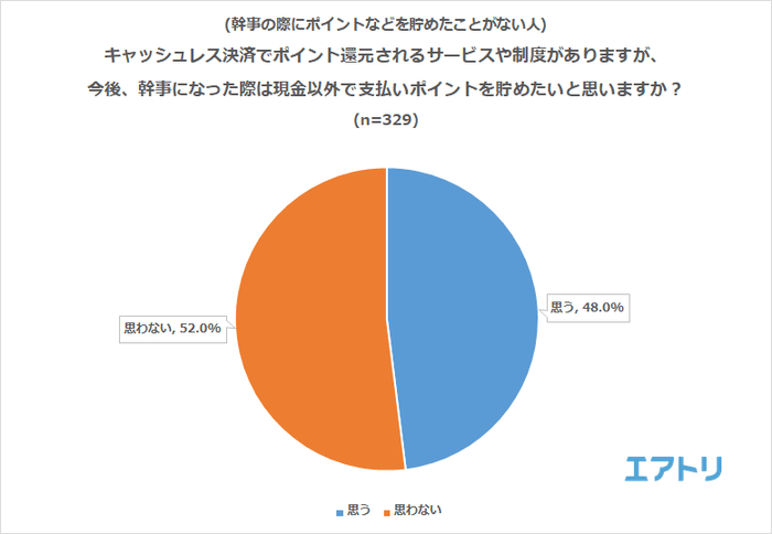 幹事の際にポイントなどを貯めたことがない人に、今後、キャッシュレス決済でポイント還元されるサービスや制度を利用したいと思うか聞いたところ「思わない(52.0%)」との回答が「思う(48.0%)」を上回りました。