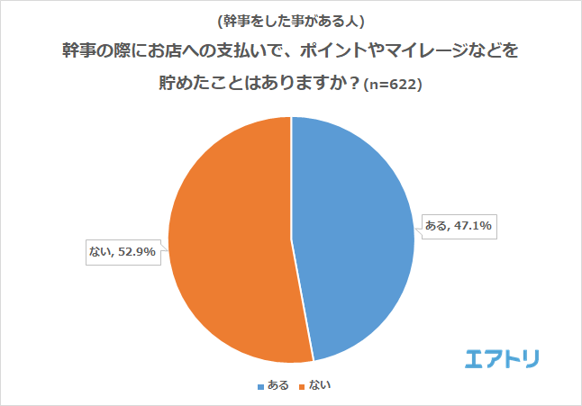 幹事をした事がある人に、お店への支払いでポイントやマイレージを貯めたことがあるか聞いたところ過半数が「ない(52.9%)」と回答しました。