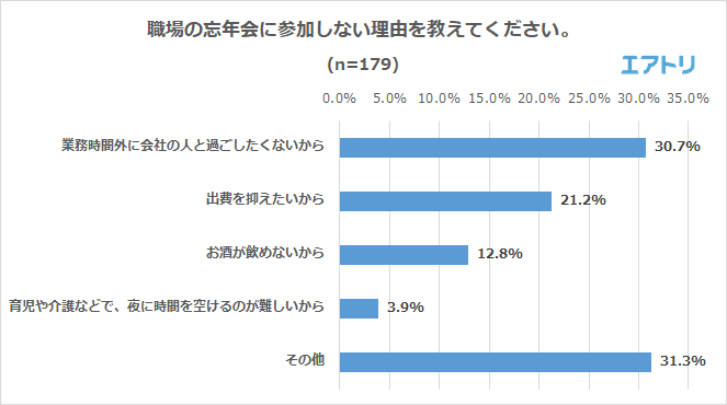 職場の忘年会に参加しないと回答した人にその理由を聞いたところ、最も回答が多かった理由は「業務時間外に会社の人と過ごしたくないから(30.7%)」でした。次に「出費を抑えたいから(21.2%)」、「お酒が飲めないから(12.8%)」が続きました。