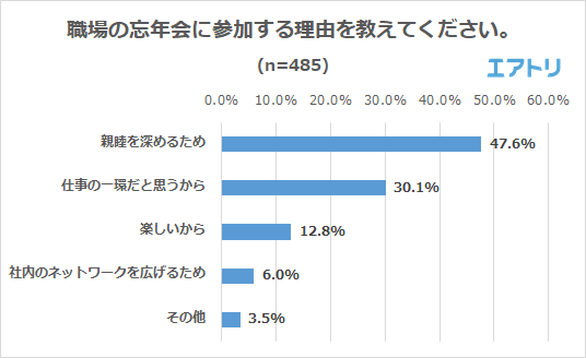 ―職場の忘年会参加理由は半数が「親睦を深めるため(47.6%)」と回答しました。続いて「仕事の一環だと思うから(30.1%)」、「楽しいから(12.8%)」が選ばれました。
