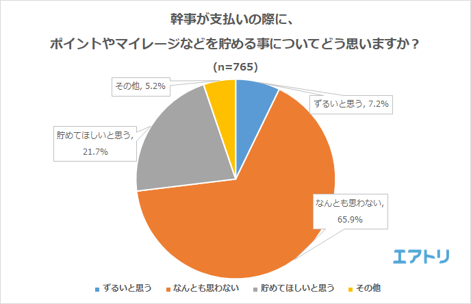 幹事が支払いの際にポイントやマイレージを貯める事に対してどう思うか聞いたところ、6割以上の人が「なんとも思わない(65.9%)」と回答しました。1割以下が「ずるいと思う(7.2%)」と回答する一方でその約3倍の人が「貯めてほしいと思う(21.7%)」と答えました。