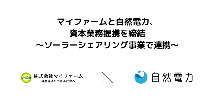 株式会社マイファーム(本社:京都府京都市、代表取締役:西辻一真、以下「マイファーム」)と、自然電力株式会社(本社:福岡県福岡市、代表取締役社長:磯野謙、川戸健司、長谷川雅也、以下「自然電力」)は、2023年5月17日をもって、資本業務提携契約を締結したことをお知らせいたします。