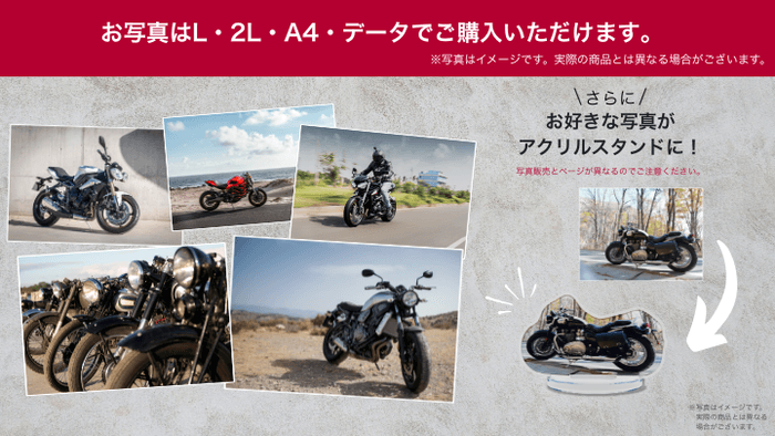 ※ご自身のバイク写真でアクリルスタンドを製作される場合は、本サービスにて決済完了後、後日お送りするメールに記載の送付先まで写真をお送りください。