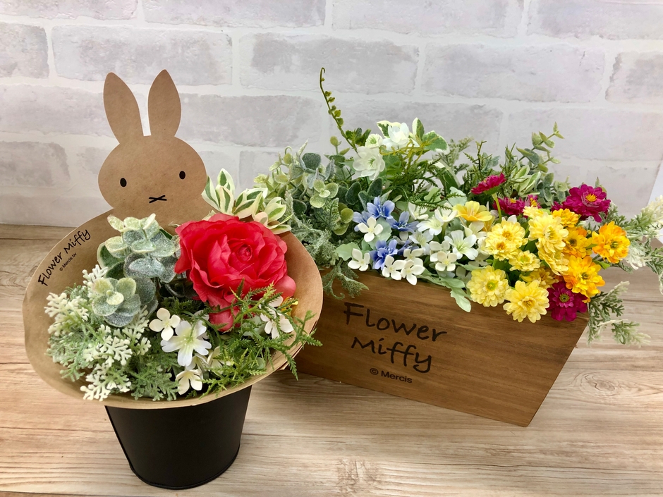 「フラワーミッフィーあべのand 店」では、オランダの人気絵本「ミッフィー」をテーマとしたクオリティの高いアーティフィシャルフラワーの数々を取り揃えております。お客様ご自身がビュッフェスタイルで、お好みのお花と花瓶とをお選びいただきオリジナルのギフトをお作りいただけます。また、フラワーミッフィーのお店でしか買えない限定グッズなどの販売も同時に行います。