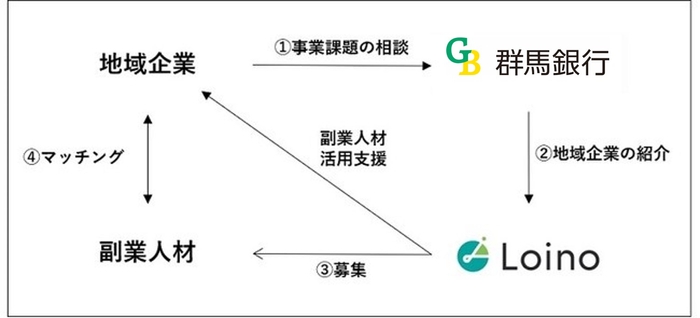 本業務提携において群馬銀行は、強みとする事業性評価を活かし、取引先企業の真の人材ニーズを見極めたうえで適切な副業人材を「Loino」を通じて紹介し、「Loino」は、副業人材と企業とのマッチングとフォローアップを行います。