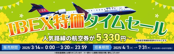 アイベックスエアラインズ株式会社(本社:東京都江東区、以下 IBEX)は、2025年4月~7月ご搭乗分が対象となる「IBEX特価タイムセール」を実施します。