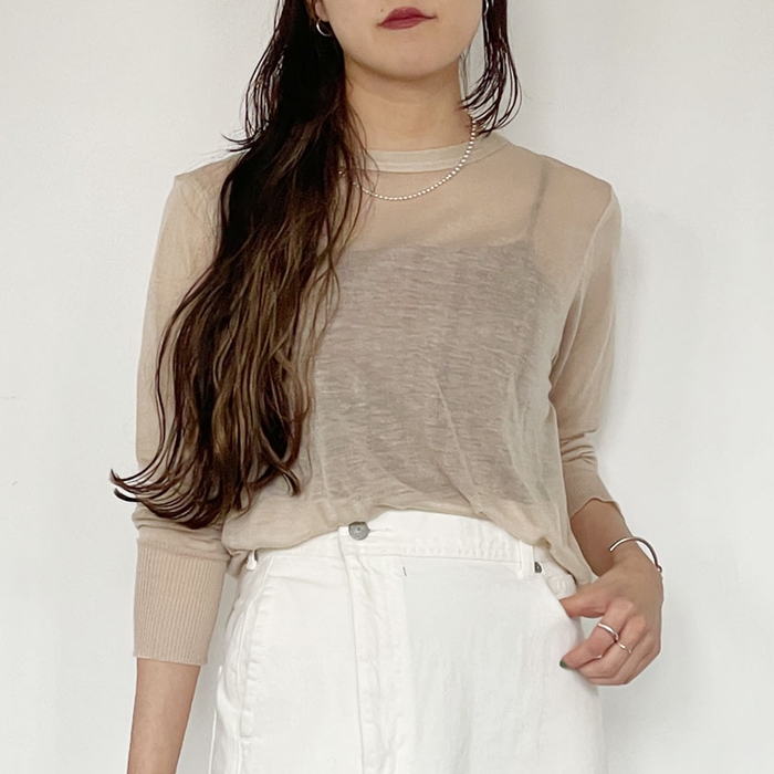 もちろん、ジレやベスト、ジャケットなどのインナーにしたいときにも襟ぐりのデザインが邪魔をしないので、一枚持っているとマルチにお使いいただけるおすすめアイテムです。