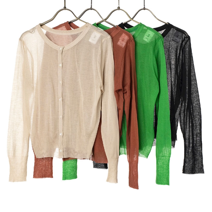 生地がとても柔らかく伸縮性に優れ、保湿性が高いのが特徴で、脇に縫い目のない縫製方法(ホールガーメント)なので透け感を邪魔せず、快適な着心地で環境にも優しいカーディガンです。