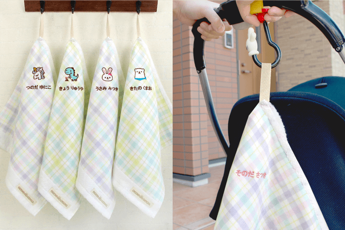 保育園・幼稚園で使用するタオルは、一般的なハンドタオルよりも大判タイプのループつきを指定する園が多いため、その規格で展開しました。保育園に通わせる予定があれば1歳頃から通園にご使用いただくこともでき、お子さまがご家庭で手を洗う練習として、専用の手拭きタオルとして用意するのもオススメです。