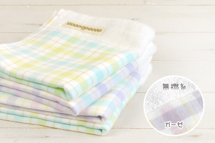 お子さまでも大人のような服を好む時代に合わせ、ナチュラルカラーを意識したオリジナルタオル。おもては肌に優しいガーゼ生地を採用しました。うらの無撚糸は普通の糸にくらべ、ふんわりやわらかな手ざわりです。繊維のあいだにすき間が多いのでさっと拭くだけでも吸水性が良く、小さなお子さまでも使いやすい生地です。