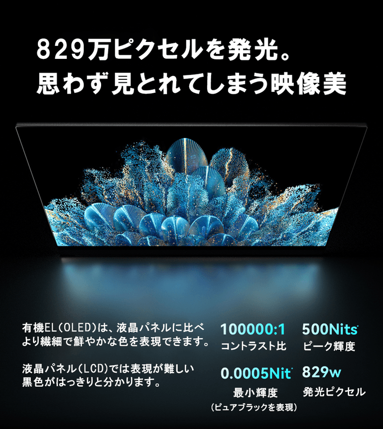 829万個の有機EL素子に直接電流を流すことで繊細かつ色鮮やかな美しいディスプレイを表現。ネイティブ解像度は4K(UHD:3,840×2,160)。液晶パネルでは表現できないピュアブラックも細かく表現可能。どの角度からも美しく鮮明に表示されます。