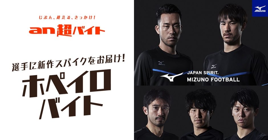 「an超バイト」×「MIZUNO FOOTBALL」 “ホペイロ”バイト募集! ミズノブランドアンバサダーの岡崎慎司選手・吉田麻也選手らに 新作スパイクをお届け!