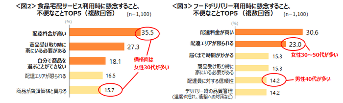 食品宅配サービス、フードデリバリーともに「配達料金が高い」「商品受け取り時に家にいる必要がある」「配達エリアが限られる」といった配達・受取に関する項目がTOP5にランクイン。価格面は女性、特に30代の回答が多く、配達料金や店頭価格との差を気にしている。