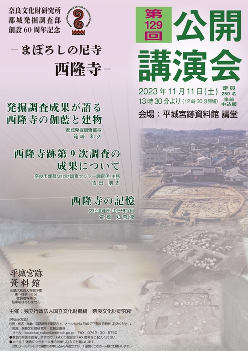 [奈文研イベント] 奈良文化財研究所都城発掘調査部創設60周年記念 奈良文化財研究所 第129回公開講演会「まぼろしの尼寺西隆寺」(聴講無料)のご案内