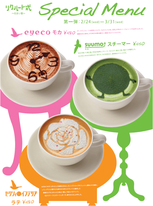 2月24日(水)より『リクルート式~住まい篇~』と題して、住まいとインテリアをテーマにリクルートの提供している3つのサービスを紹介。カフェならではの「美味しい」特別企画が満載です。