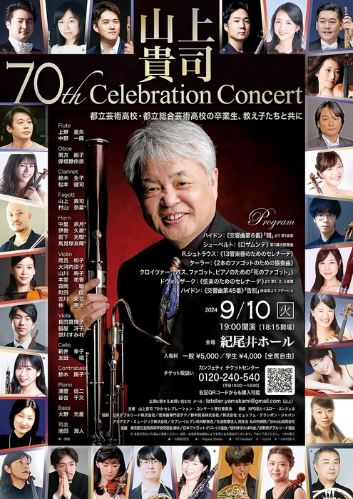 ファゴット奏者・山上貴司の70歳を記念して、長年指導に尽力してきた都立芸術高校・都立総合芸術高校の教え子たち、仲間たちが集結。