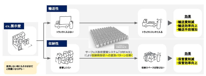 「ORIFACE for Transport」は、サーフェス形状探索システム「ORIFACE」を用いることで変形可能な表面構造に置き換え、製品の輸送性/収納性を向上することに特化したサービスです。