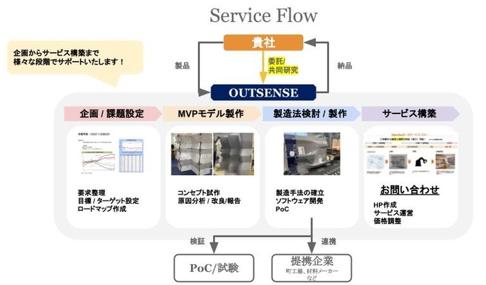 本サービスでは、貴社製品と折りを掛け合わせることでどんな課題解決、新製品開発ができるかを検討する【製品企画フェーズ】、製品コンセプトを備えた試作品開発を行う【MVPモデル製作フェーズ】、製造手法や性能向上を行う【製造法検討/製作フェーズ】、製品の販売サイト構築や、サービス運営などを行う【サービス構築フェーズ】があり、幅広くご依頼を承っております。