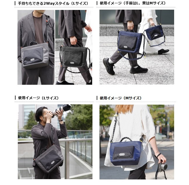 Lサイズはレンズ付きミラーレス一眼カメラと70-200mm F2.8クラスの交換レンズ1本などの収納が可能な十分な容量を、Mサイズには標準ズームレンズを装着したミラーレス一眼カメラと交換レンズや小物類の収納が可能です。