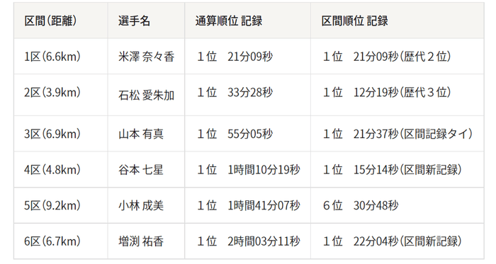 総合タイムは2時間03分11秒で、2位のチームに2分31秒と大差をつけて、1区から一度も首位を譲らない女王のレースで圧倒しました。