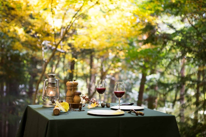 星のや富士の森に囲まれたスペースにテーブルや椅子、ブランケットなどを設え、屋外でも快適に過ごせる空間を用意します。特別席の場所には、カエデやモミジ、ハクウンボクの木が立ち並び、秋になると葉が黄色く色づく「黄葉」を楽しめます。秋が深まるにつれて緑から黄色へと色を変える葉や、絨毯のように広がる落ち葉など、秋の森ならではの景色を眺められる場所です。木漏れ日が差す開放感あふれる空間で料理を優雅に味わいます。