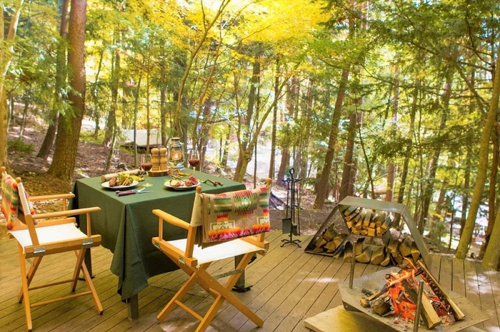 各施設が独創的なテーマで、圧倒的非日常を提供する「星のや」。日本初のグランピングリゾート「星のや富士」では、2022年10月1日~11月30日まで、旬の狩猟肉と秋の味覚を焚き火で楽しむランチ「黄葉焚き火BBQ」を今年も提供します。星のや富士の敷地内の森に設えた、美しい黄葉を眺められる特別席で、狩猟肉や松茸など、秋の食材を味わうランチです。今年はシェフのサポートのもと、焚き火を使った多様な調理法で、食材がもつ本来の旨味を味わいます。
