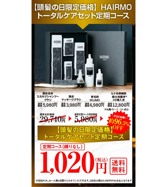 【期間限定キャンペーン】10月20日は「頭髪の日」 通常合計価格より約96.5%OFFの1,020円(税込)で提供! 「HAIRMO頭髪ケアキャンペーン」を開催