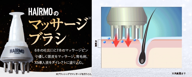 HAIRMOは、「頭皮洗浄スカルプブラシ・育毛剤『IKUMO』・ヒト毛根細胞順化培養液X5導入液・頭皮マッサージブラシ」の4点セットで発毛を促進します。