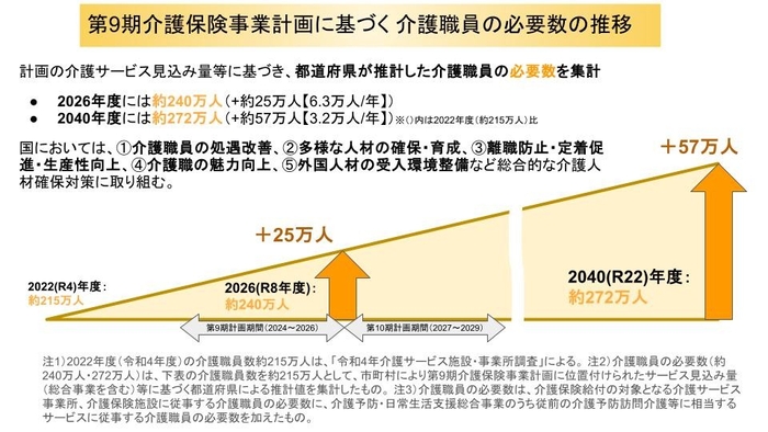超高齢社会を迎えた日本において、介護職の人材不足は喫緊の課題となっています。第9期介護保険事業計画によれば、2022年度の約215万人から、2026年度には約240万人(年間約6.3万人の増加)、2040年度には約272万人の介護職員が必要とされています。つまり、今後わずか数年で約25万人もの介護人材を新たに確保しなければならない状況です。