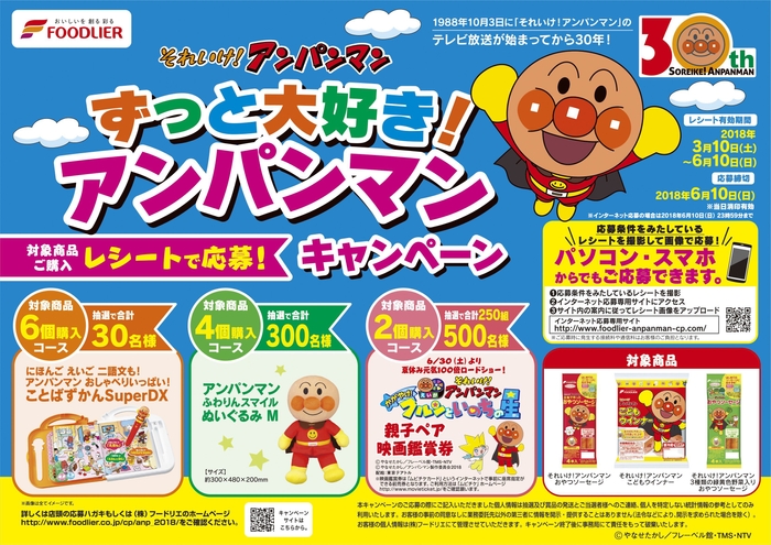 株式会社フードリエ(本社:大阪府高槻市、代表取締役社長:石野 克彦)は、2018年3月10日(土)~6月10日(日)の期間で、『それいけ!アンパンマン ずっと大好き!アンパンマンキャンペーン』を実施いたします。