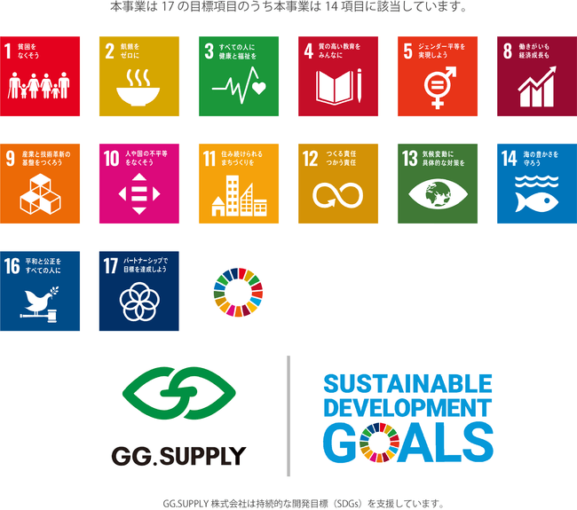 GG.SUPPLY株式会社は持続可能な開発目標(SDGs)の17の目標項目のうち本事業は14項目に該当しています。新型コロナウイルス感染症(COVID-19)、フードロス、環境問題、健康問題等、世界における社会問題の解決を目指しています。