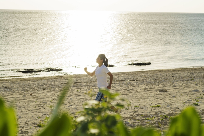 星のや沖縄の前に広がる自然海岸でウォーキングを行います。砂浜の上を歩くウォーキングでは通常よりも圧力がかかり、ほどよく身体への負荷を感じられます。夕陽が美しい西海岸の景色を堪能しながら、30分ほどのウォーキングを楽しみます。