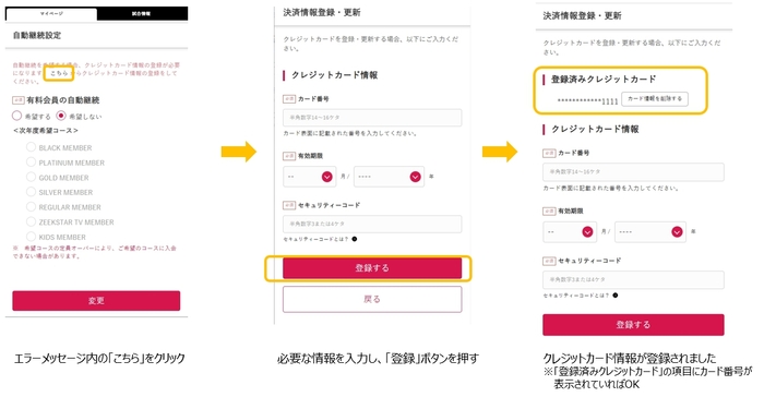 ※1 手続きいただいても、クレジットカードの有効期限切れや登録情報の不備などで支払いができなかった場合は継続手続きができず、自動的に無料会員となります。