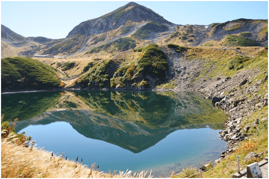 室堂平・みくりが池:紺碧の水面に映し出される立山