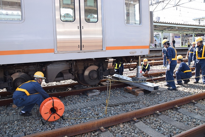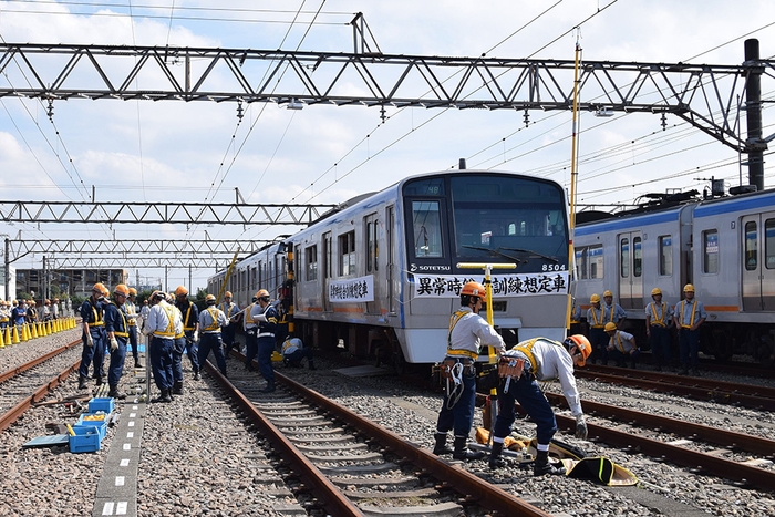 今回は、「希望ケ丘駅~三ツ境駅間の踏切で特急列車がトラックと衝突し、列車が脱線した」という想定のもと、約230人(相模鉄道:約200人、大和市消防本部・大和警察署:約30人)が参加し、事故にあった列車内からお客さまを避難誘導する訓練や、脱線した車両をレールの上に戻す復旧訓練などを行います。