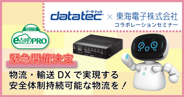アルコール検知システム、IT点呼システム、運行管理システムを開発・販売する東海電子株式会社(本社:静岡県富士市 代表取締役 杉本 哲也)は、この度、事故の無い社会、地球環境を守る社会を目指し、車に関わる全てのお客様を支援する製品の開発、販売をする株式会社データ・テック(本社:東京都大田区 代表取締役社長 森島 敬一朗)との合同ウェビナー「物流・輸送DXで実現する安全体制持続可能な物流を!」を3月26日(水)に緊急開催いたします。ご参加は無料です。業界の最新動向や緊急の課題に対応するため、急な告知となりましたが、多くの皆様のご参加をお待ちしております。