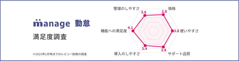 「manage 勤怠」は、ご利用企業様から2025年1月時点で65レビューを獲得しており、機能への満足度は5点満点中、4.1点評価をいただけております。