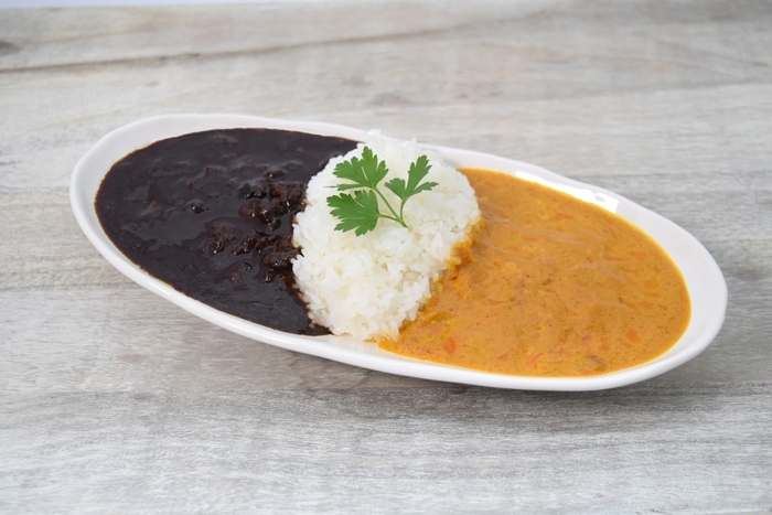 チャツネの程よい甘さが際立つブラックビーフカレーと、トマトの甘味でまろやかな味に仕上げたイエローチキンカレーです。