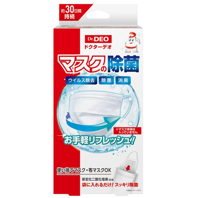 株式会社カーメイト(本社:東京都豊島区)は除菌・消臭剤『ドクターデオ』シリーズより、マスクに付着した菌やウイルスを除去できる『ドクターデオ マスクの除菌』を、9月10日(木)より発売いたします。本製品は、安定化二酸化塩素※の「除菌消臭パック」と使用中マスクを付属の袋に入れておくだけで除菌できる独自構造(特許出願中)。食事などで外したついでに、マスクの除菌・消臭ができます。詳細は以下をご確認ください。