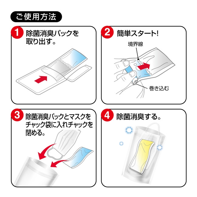 除菌剤を直接スプレーするのではなく、密閉された袋内で間接的にマスクを除菌します。隅々まで除菌でき、除菌後はすぐに装着することができます。