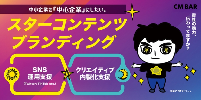 広告制作・プロモーション企画の株式会社 シー・エム・バー(愛知県名古屋市、代表取締役:恒川 昌子)は、2023年7月19日(水)より、中小企業の魅力を発見する「原石の発見」や「SNS運用支援」「クリエイティブ内製化支援」を伴走型で実施する「スターコンテンツ・ブランディング」の提供を開始します。新サービス提供の開始に伴い、7月19日(水)~21日(金)の3日間、名古屋市で開催される「JAPAN IT WEEK デジタルマーケティングEXPO」に出展し当サービスを公開いたします。
