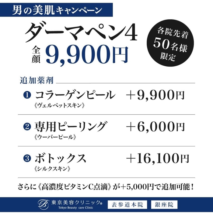 美容医療専門クリニックの「東京美容クリニック」は、「東京美容クリニック 表参道本院」(東京都港区:院長 山西智子)と「東京美容クリニック銀座院」(東京都中央区:院長 梅田剛)の両院において、ゴールデンウィークキャンペーン第2弾として、ダーマペン4を特別価格でご提供いたします〝男の美肌キャンペーン〟を開始しましたことをお知らせいたします。