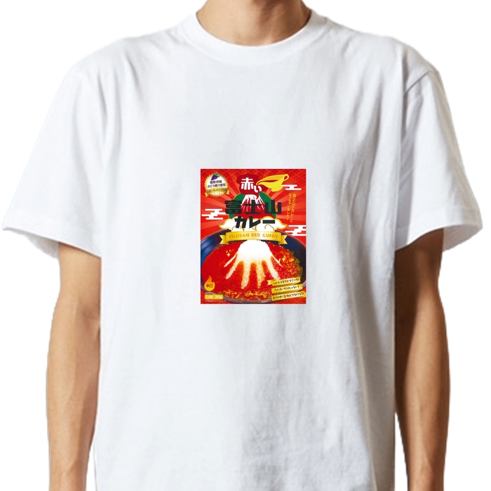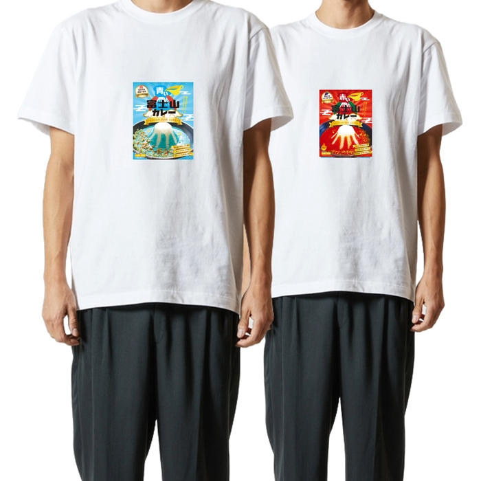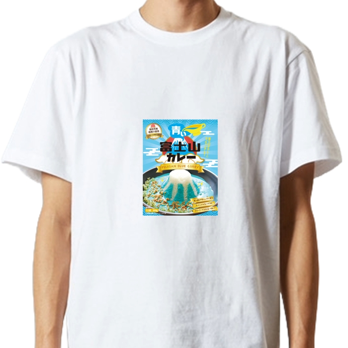 ご当地レトルトカレーの中で青いカレーで人気の青い富士山カレーのパッケージをフロントとバックの2箇所にプリントした限定Tシャツ。レトルトカレーのパッケージをそのままプリントしたグラフィックTシャツは販売店だけでしかデザインできないレアアイテム。