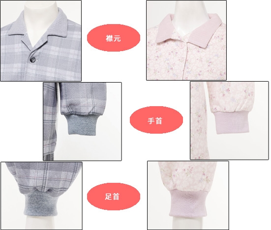 襟元、手首、足首をしっかりカバーするデザインでぬくもりを逃さず、外気も入りにくい工夫をしています
