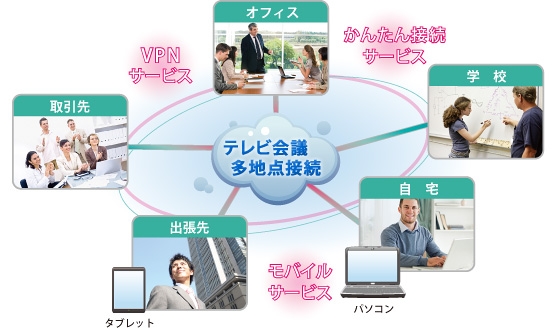 【モバイルサービス】は、【VPNサービス】との組み合わせにより、複雑なネットワーク設定を変更しなくても簡単に信頼性の高いネットワーク環境下でテレビ会議が行えるサービスです。拠点間の会議だけではなく、外出先や訪問先からの急なテレビ会議でもご活用いただけます。