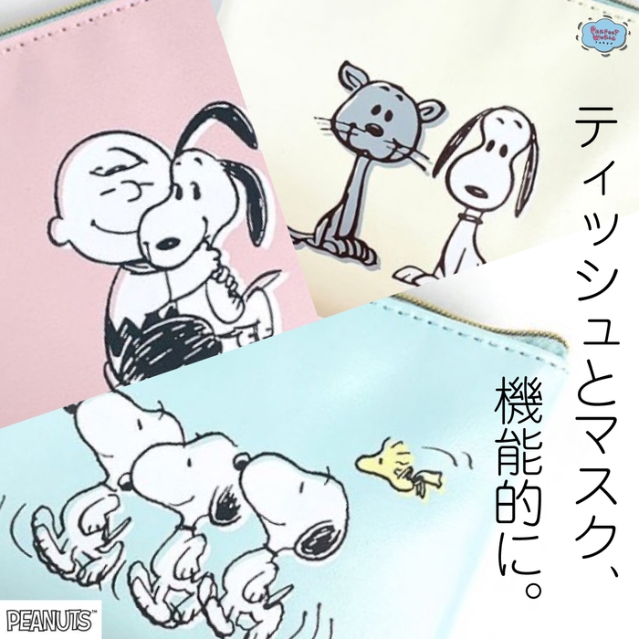 ティッシュとマスクを持ち運べる今にマストな形。スヌーピーの新作ポーチは得意のミントカラーとパステルピンク、アイボリーの3色で。