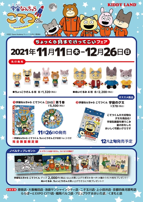 キデイランド10店舗では、『宇宙なんちゃらこてつくん』に先行販売商品であるタカラトミーアーツのちょっこりさんやぬいぐるみをご用意。期間中に発売されるアニメのDVDをはじめ、こてつくんが大好きな宇宙グミも販売いたします。