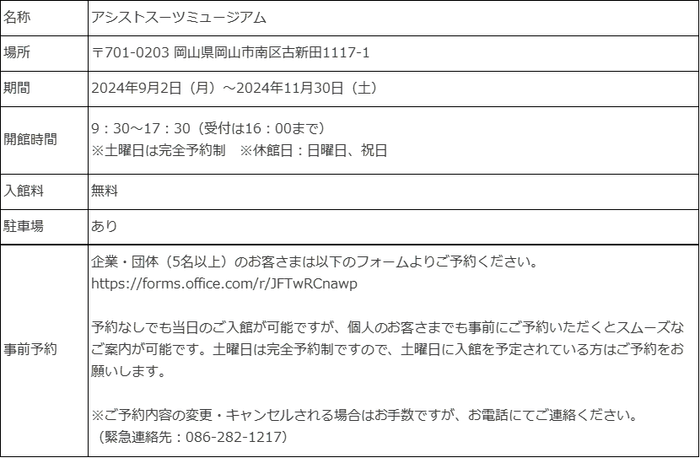 医療用品メーカーのダイヤ工業株式会社(本社:岡山県岡山市 代表取締役:松尾浩紀)は、一般社団法人アシストスーツ協会(所在地:東京都中央区 代表理事:飯田 成晃)の協力のもと、2024年9月2日(月)に、9社のアシストスーツを装着・比較ができる体験型の展示施設「アシストスーツミュージアム」を期間限定でオープンします。入館料は無料でどなたでもご入館いただけます。詳細は下記よりご確認ください。